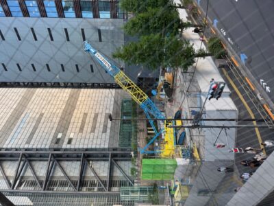翌日エディヴェダーのソロコンサートを聴きに有明ガーデンシアターへ向かうと、ゆりかもめ新橋駅で面白いカラーリングのクレーンが!!