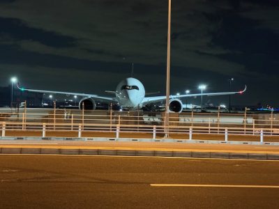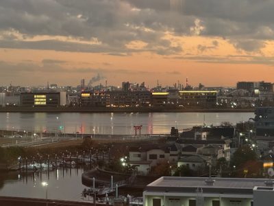 席から見える夜景を撮ったらサイバーパンクっぽくなりました。素敵!